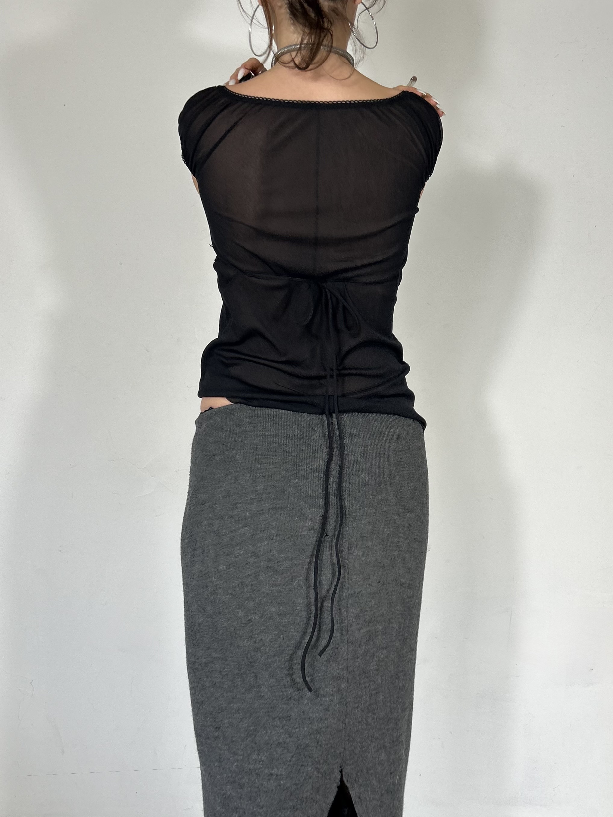 Black mesh semi sheer cami with woven ribbon detailing and tie back