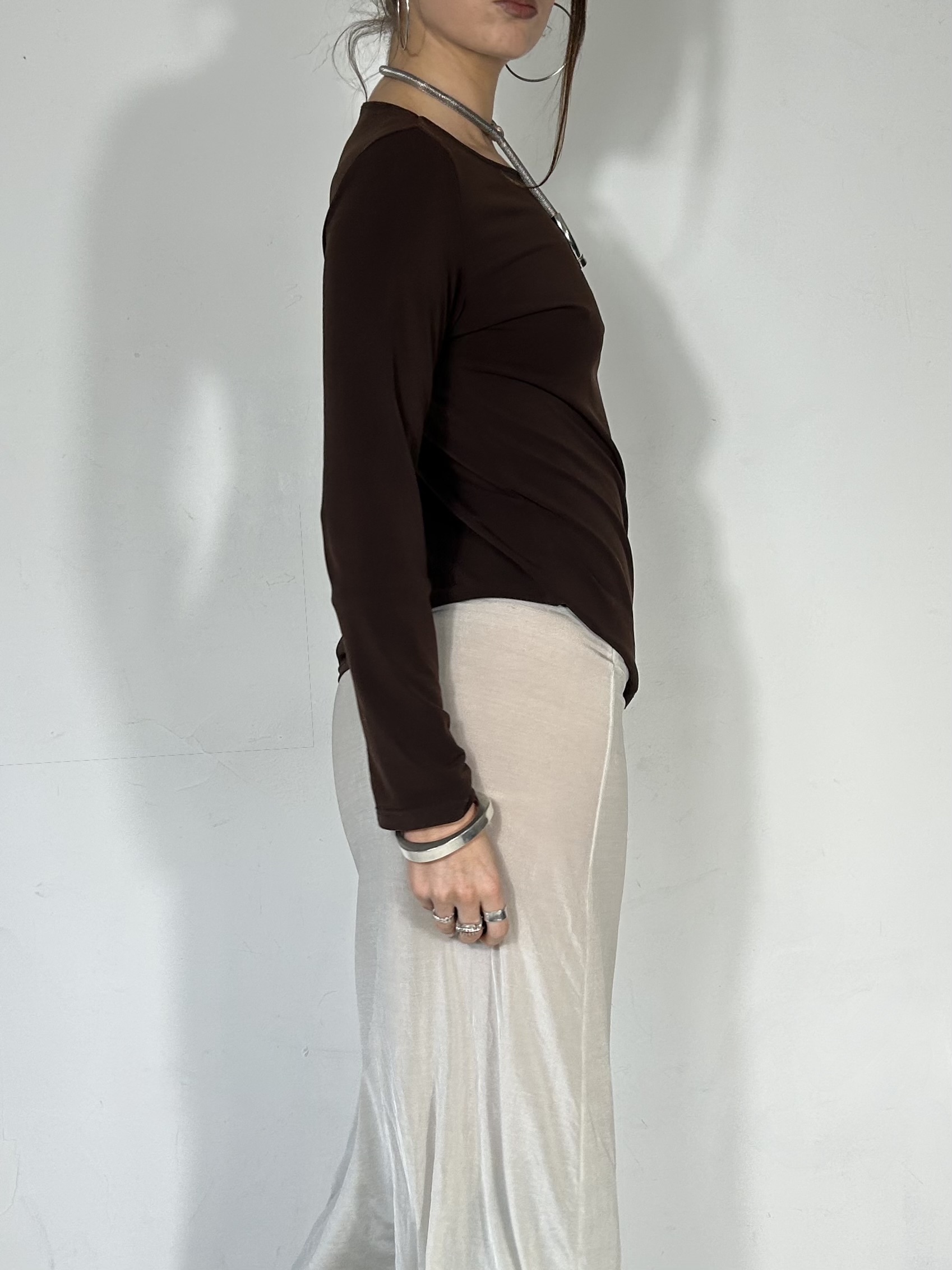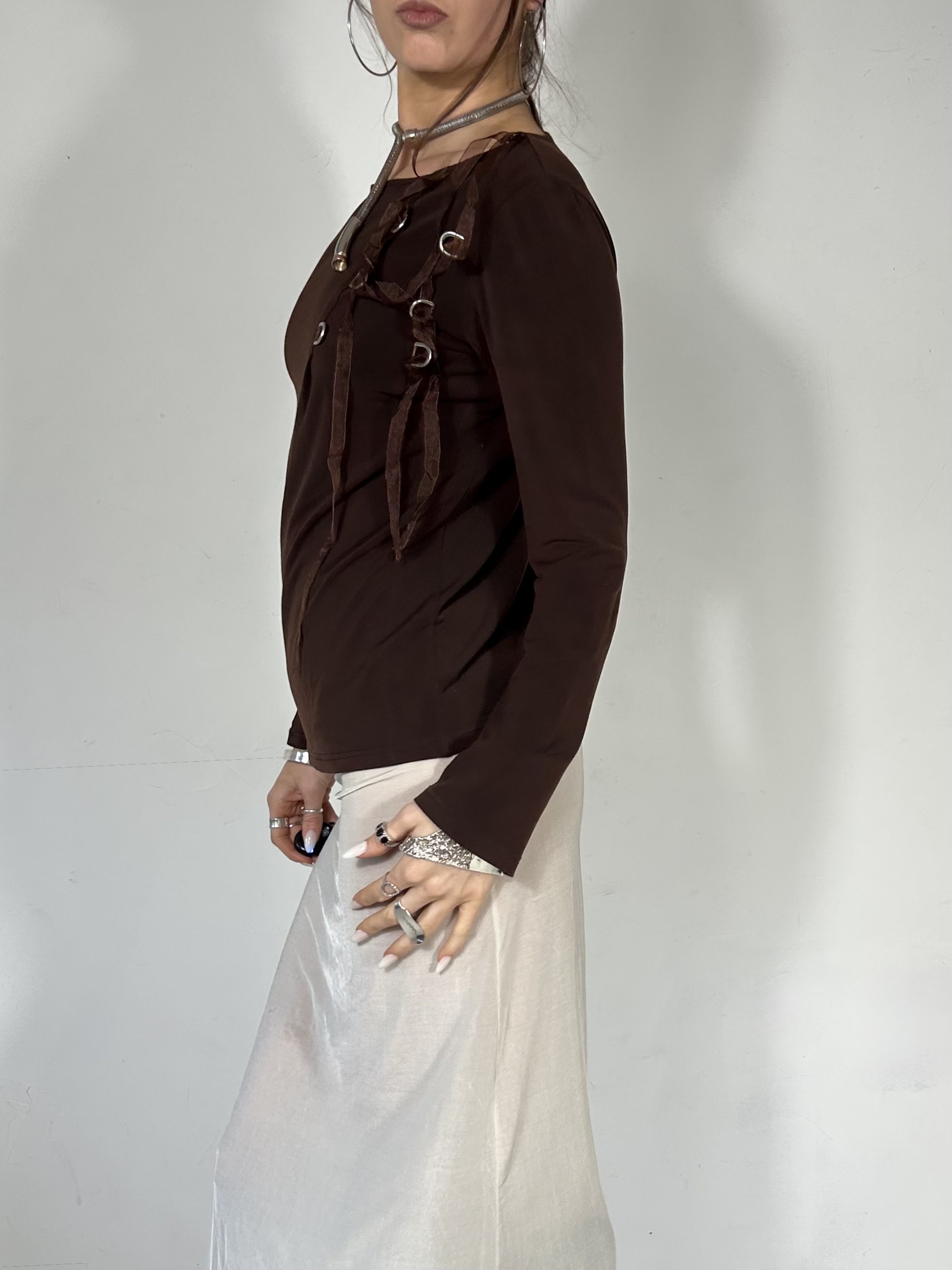 Chocolate brown long sleeve top with silver chrome hoops and ribbon detailing