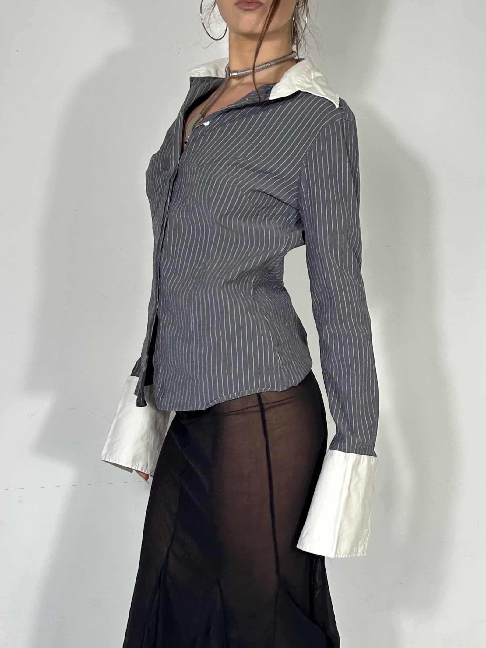 Charcoal pinstripe button up blouse with white cuff detailing