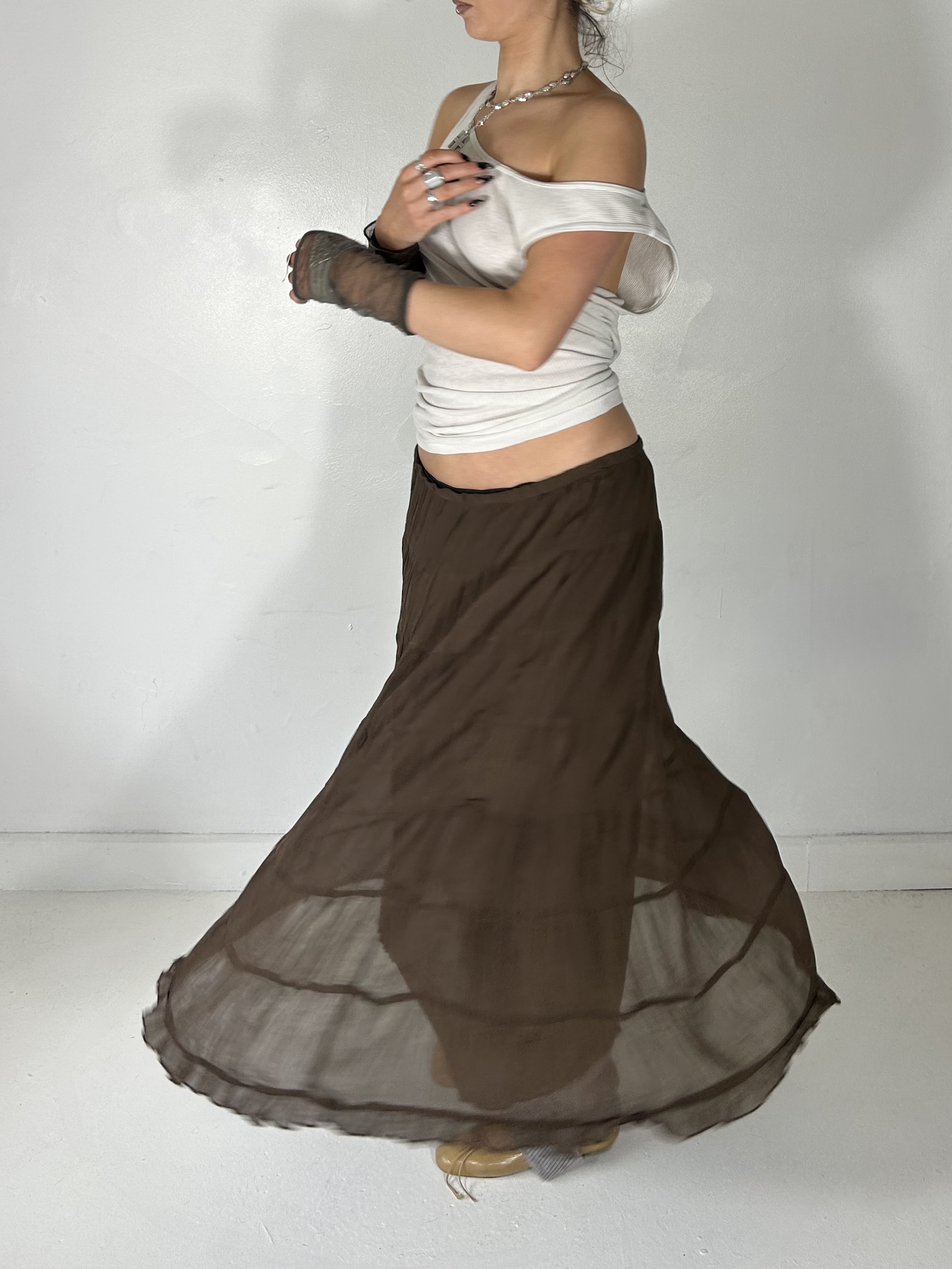 Chocolate brown textured maxi skirt with ruffle detailing, waist 32