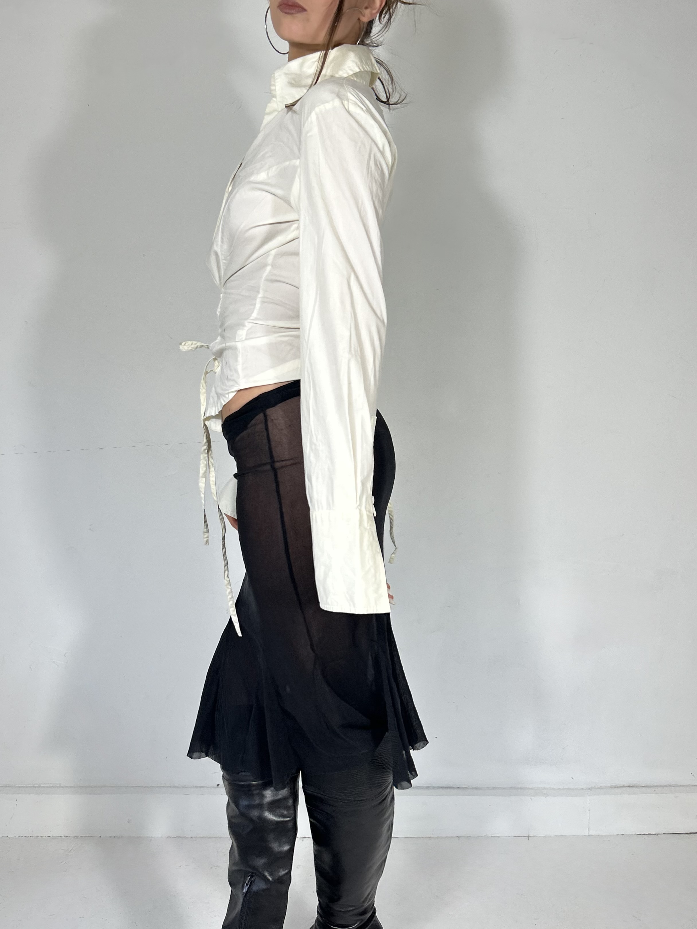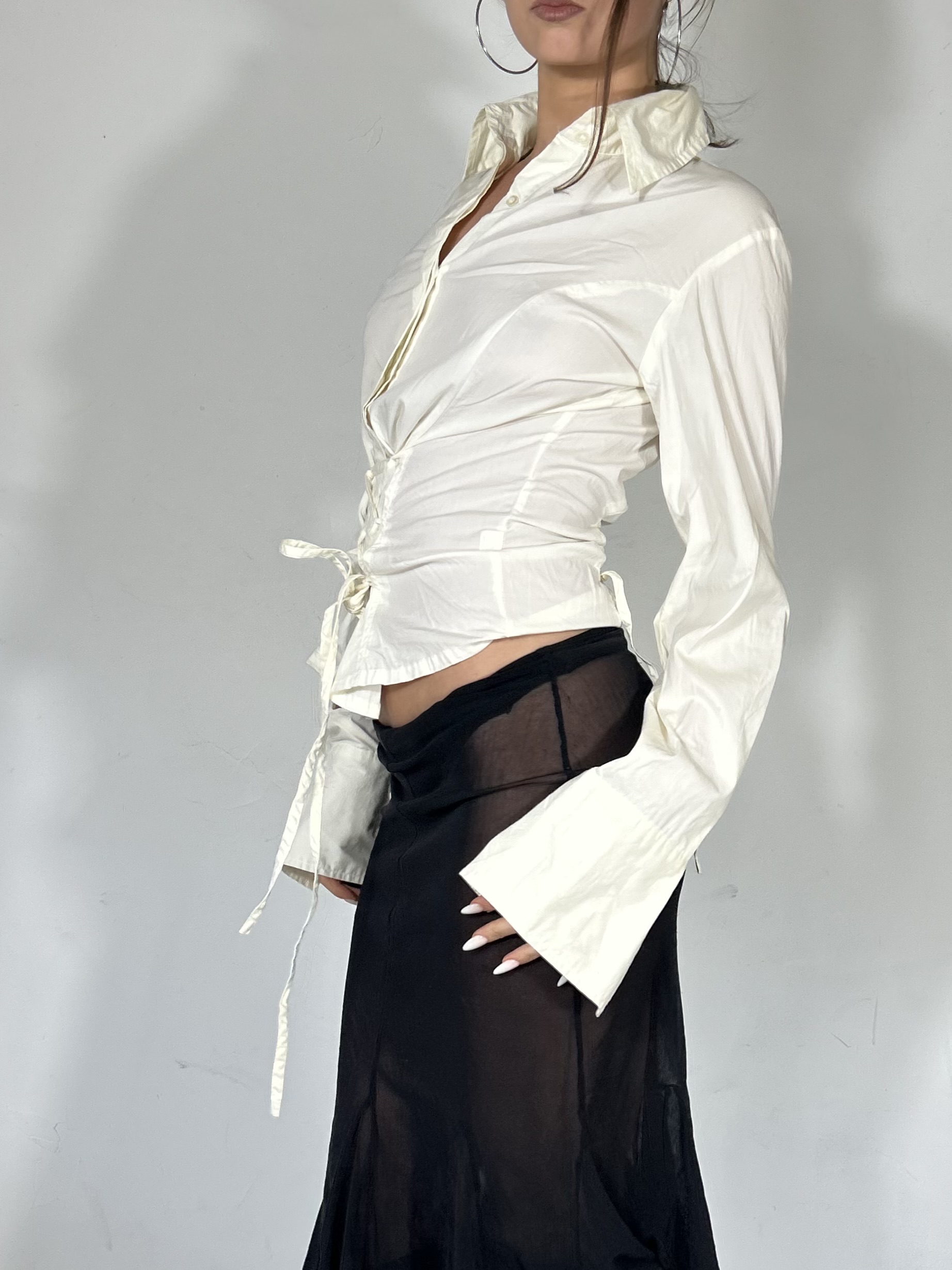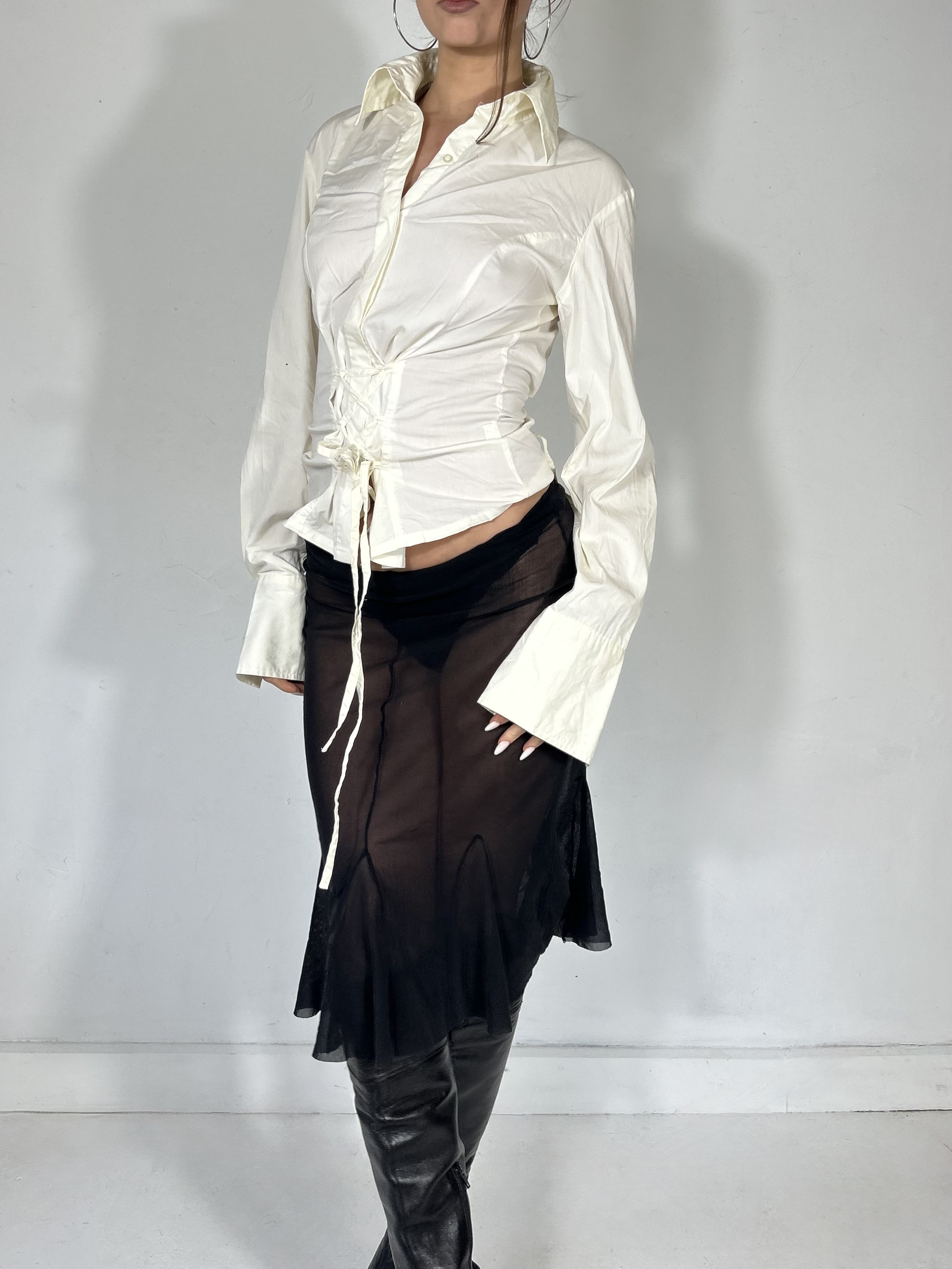 White cinched blouse with corset style lace up waist detail