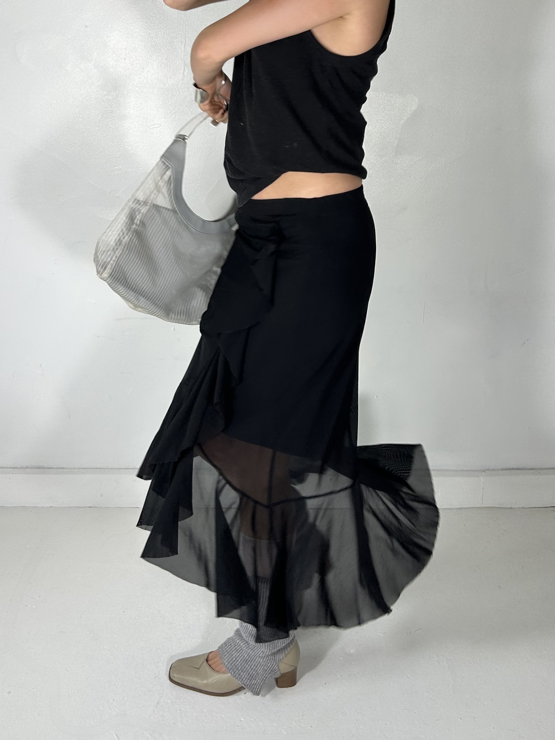 Black mesh asymmetrical maxi skirt with drape detailing, waist 28