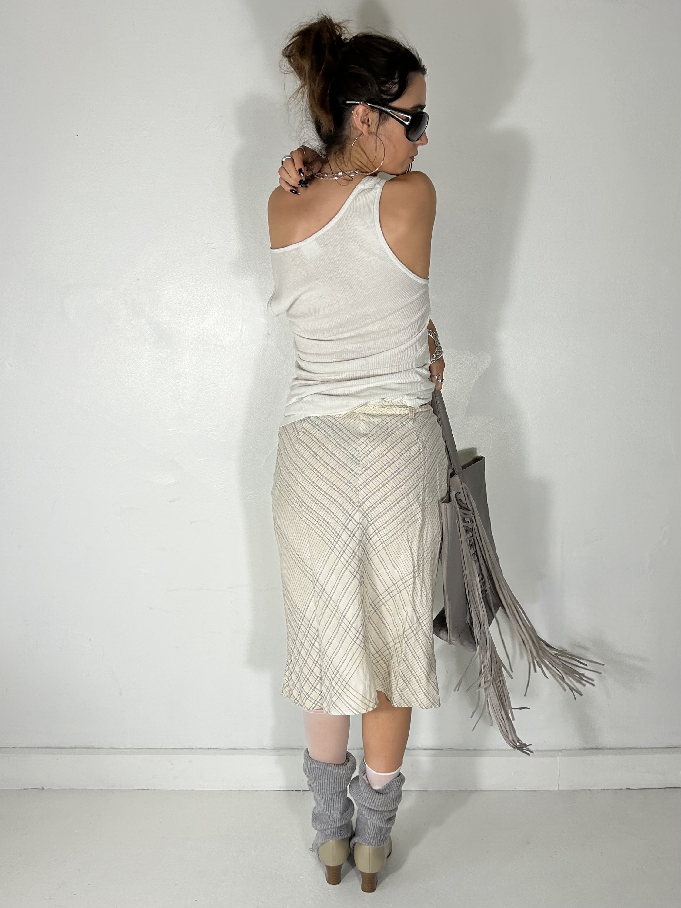 Off-white lightweight checkered midi skirt with belt detailing, waist 28"