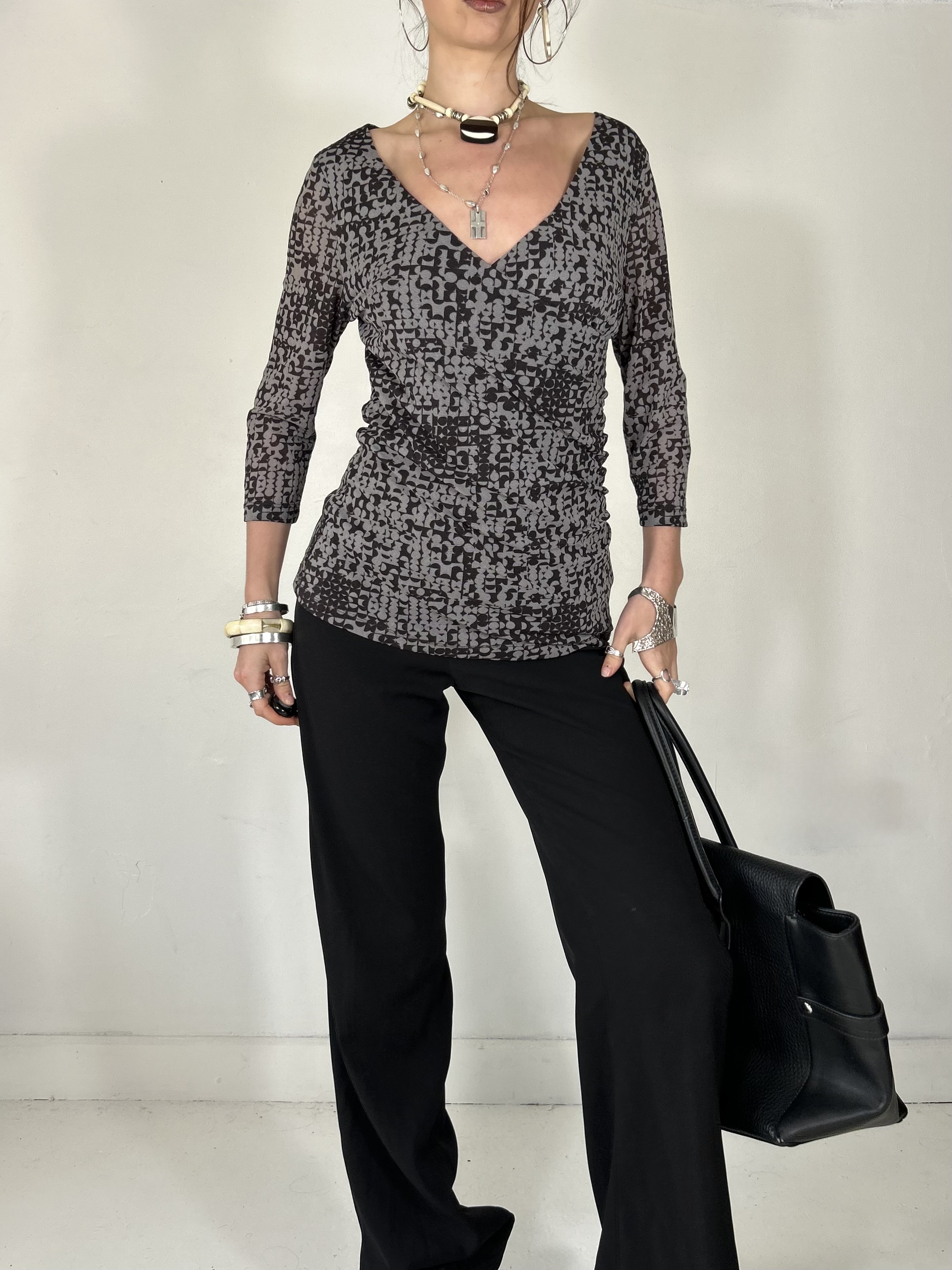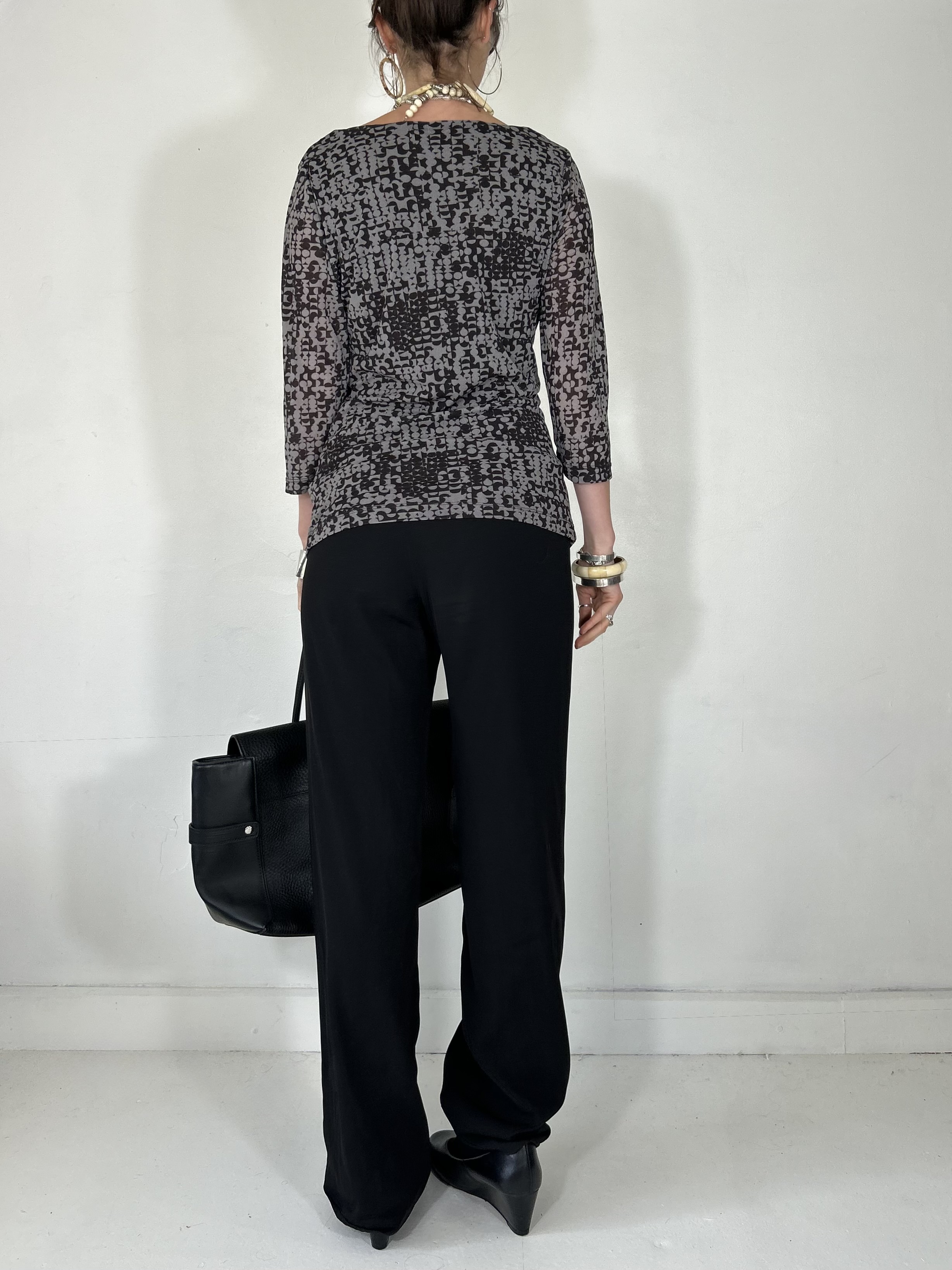 Charcoal grey geometric mesh 3/4 sleeve top