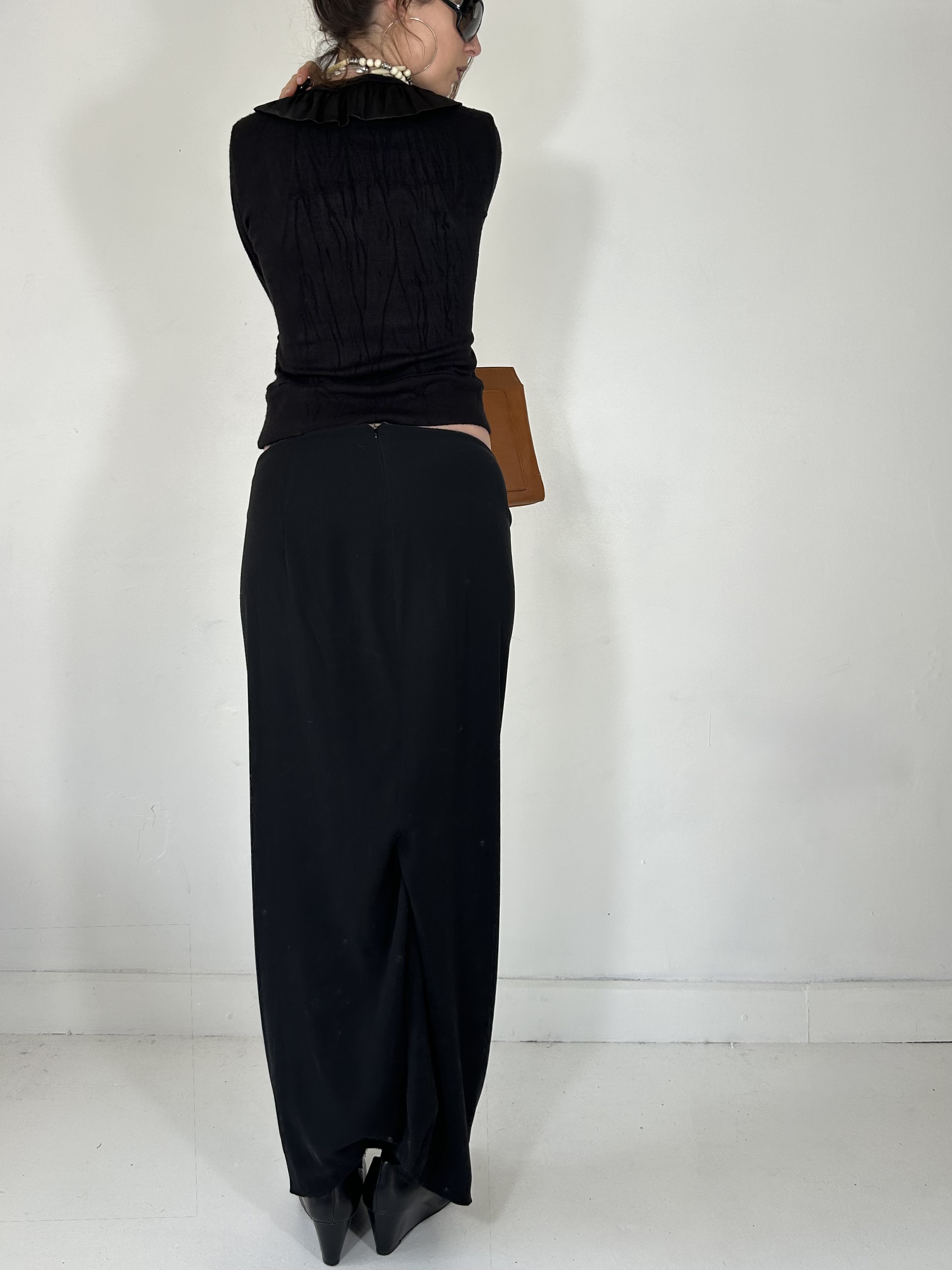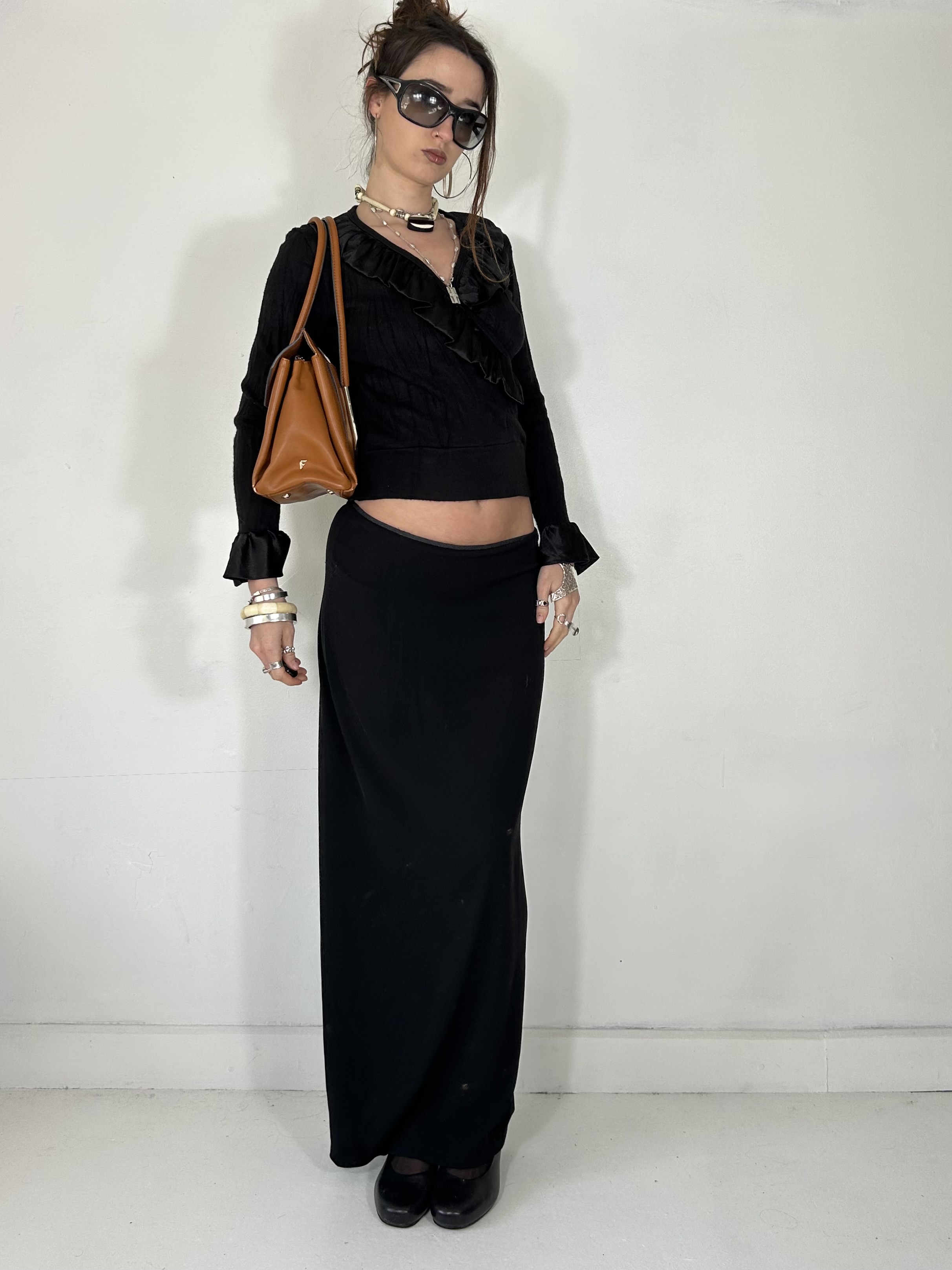 Black knit wrap style top with ruffle detailing