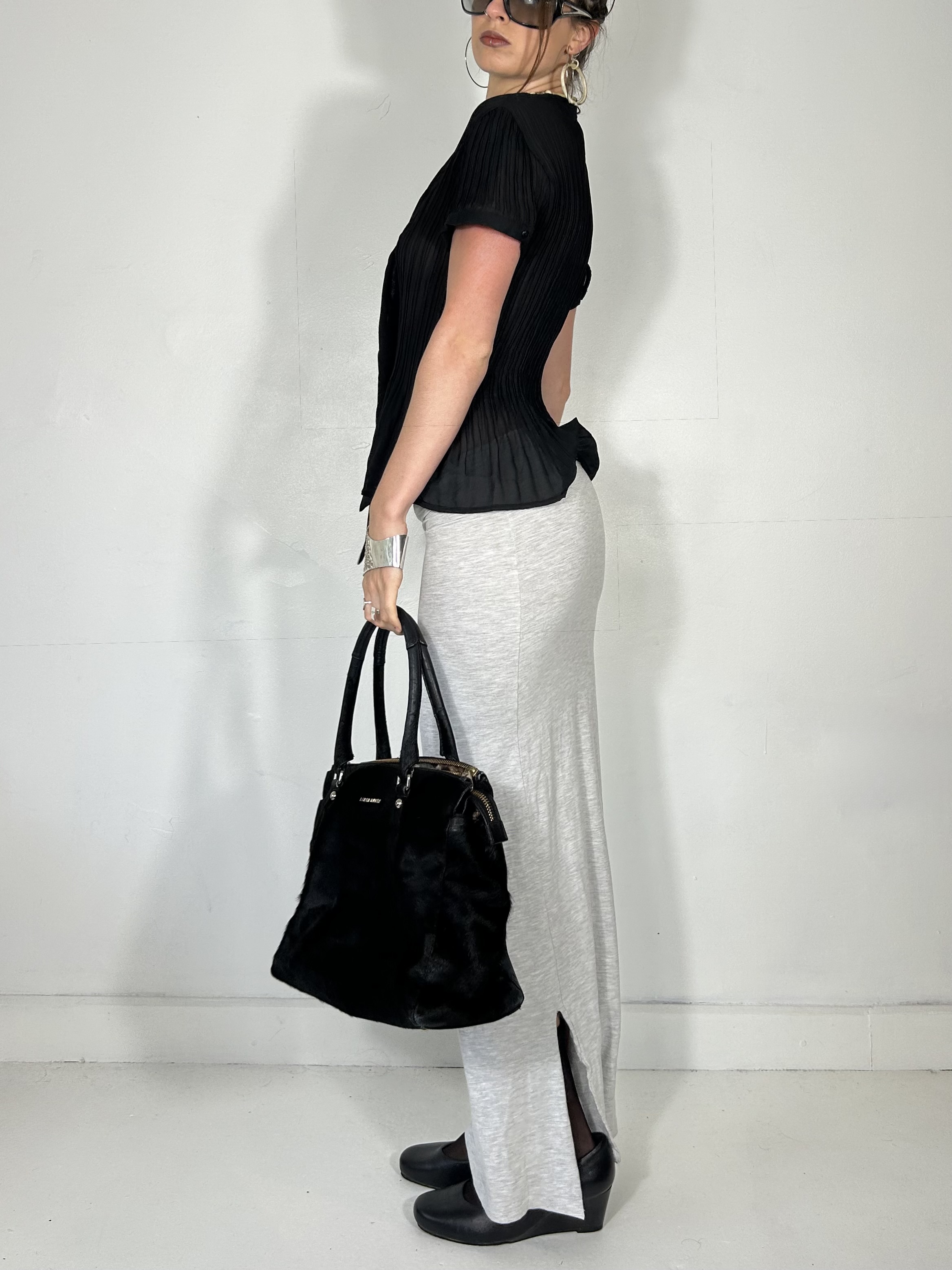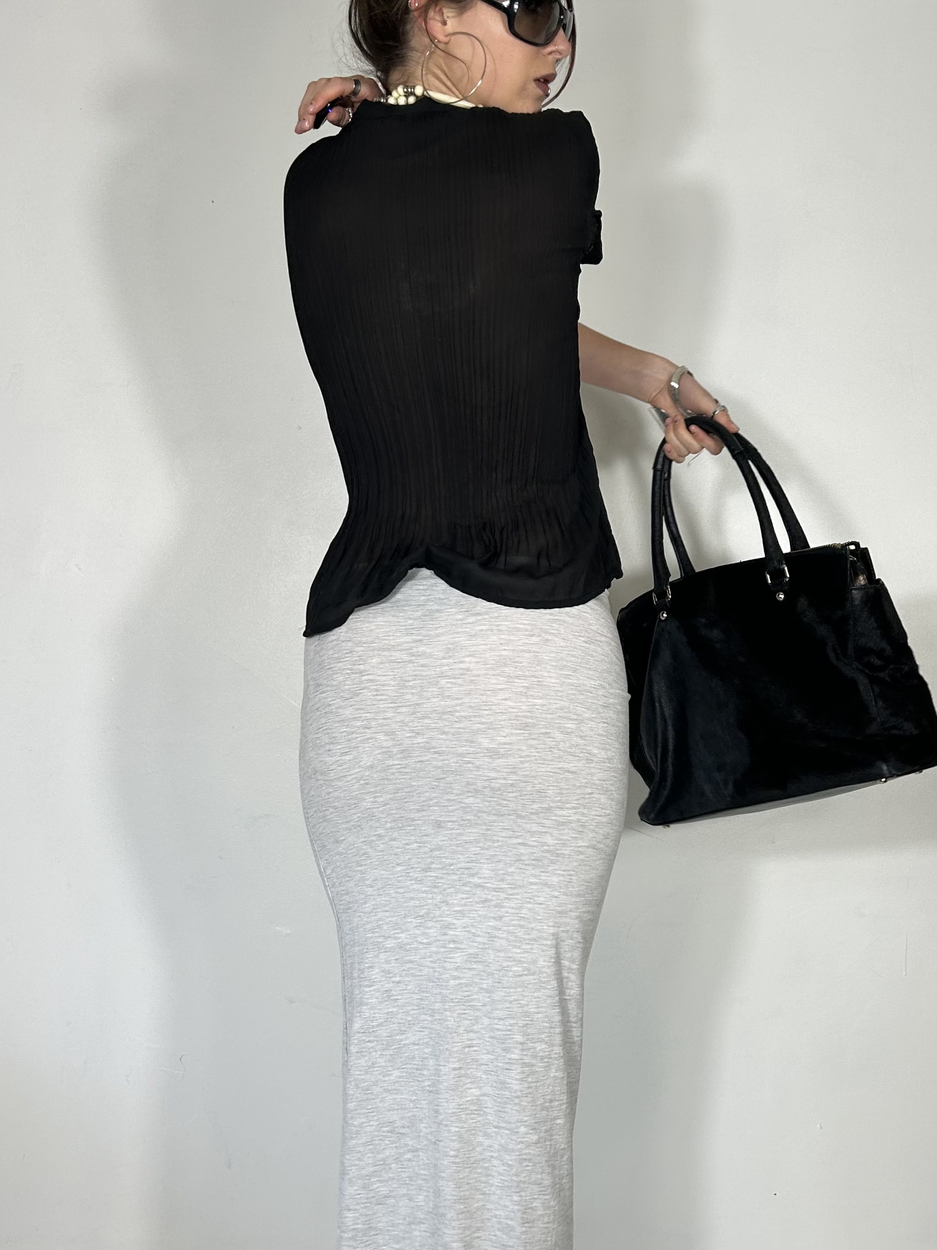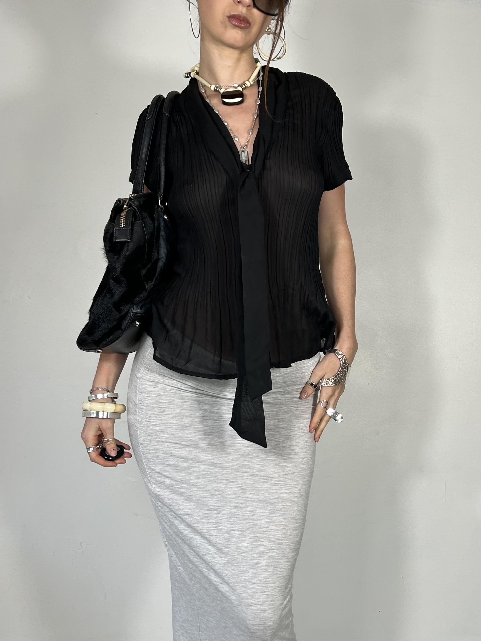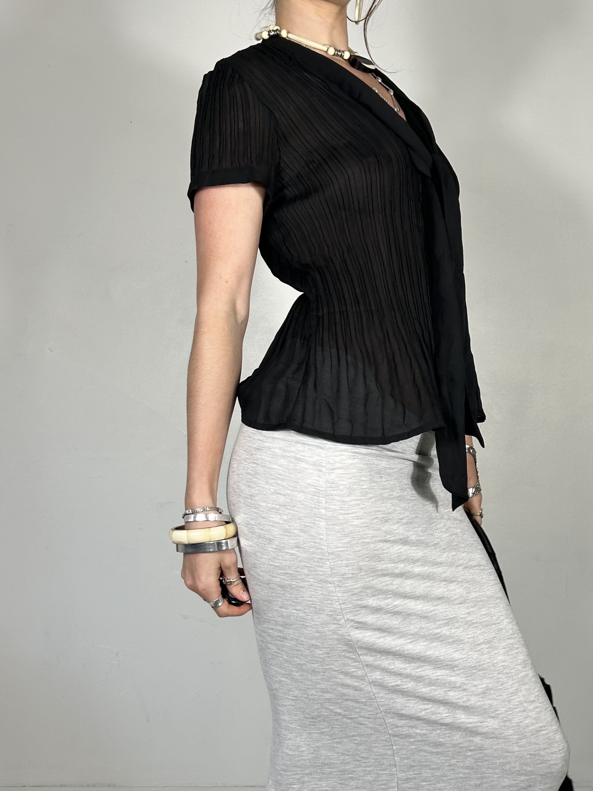 Black pleated semi sheer tee with tie detail