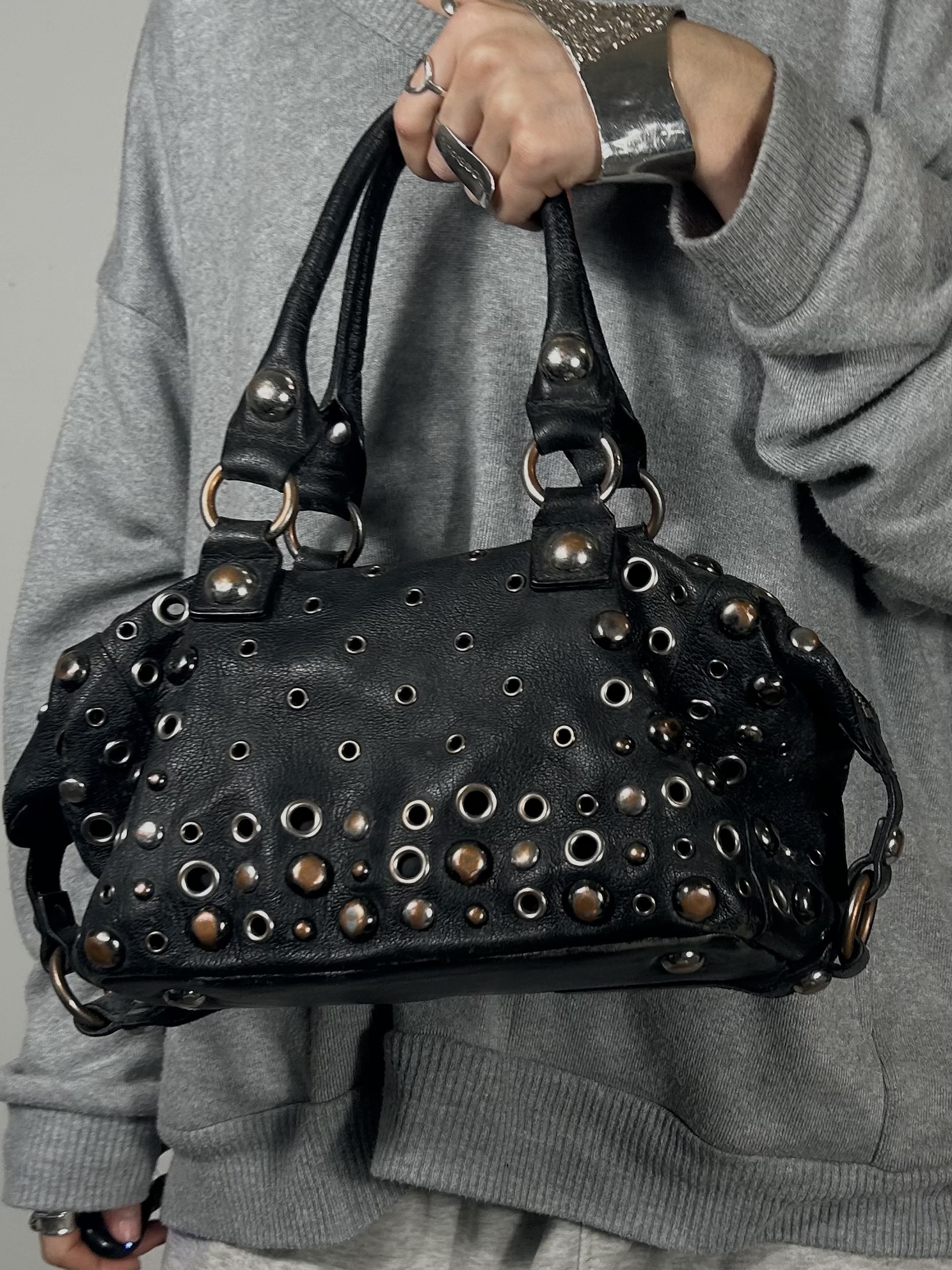 Black leather Karen Millen bag with silver stud detailing