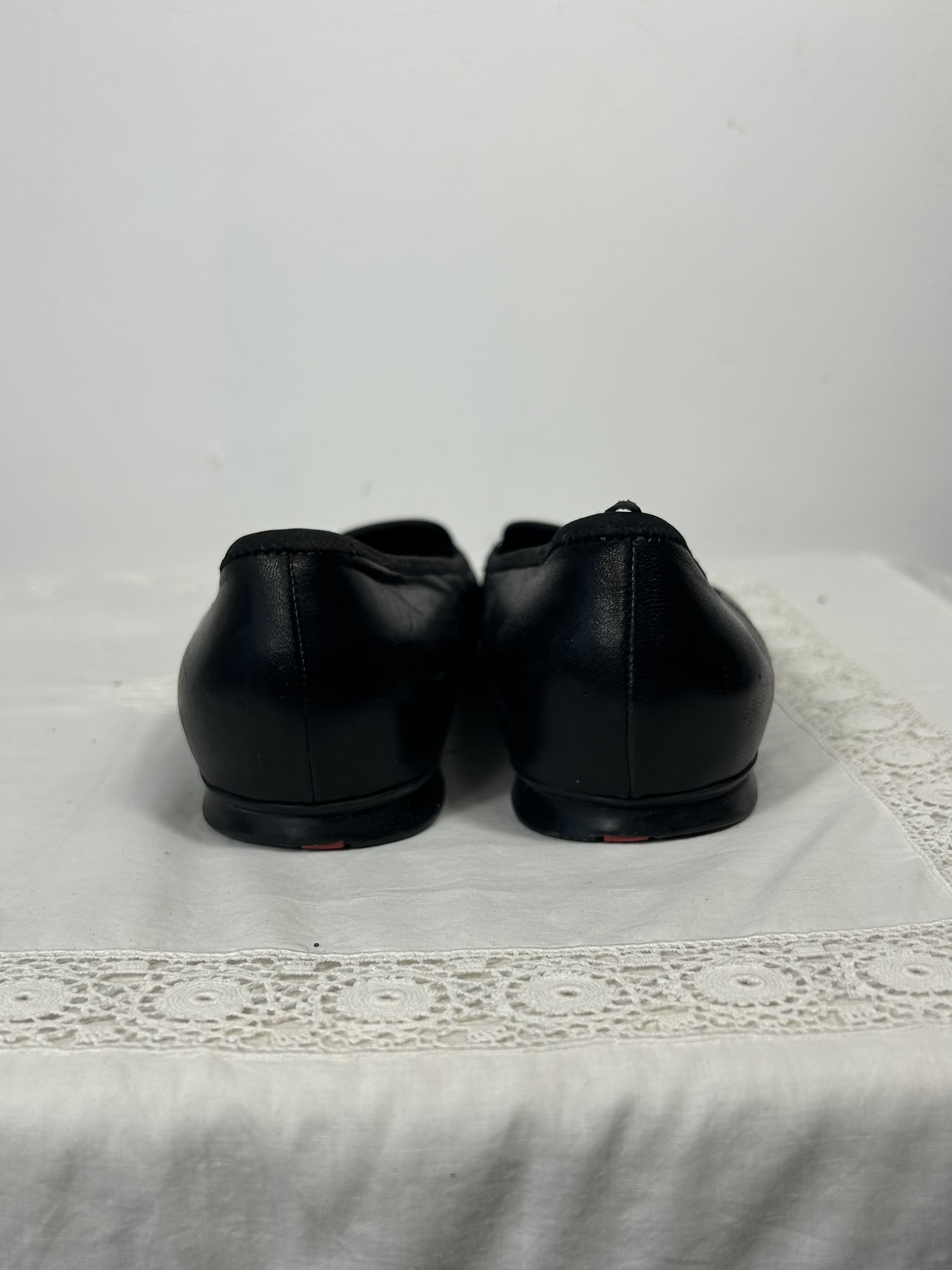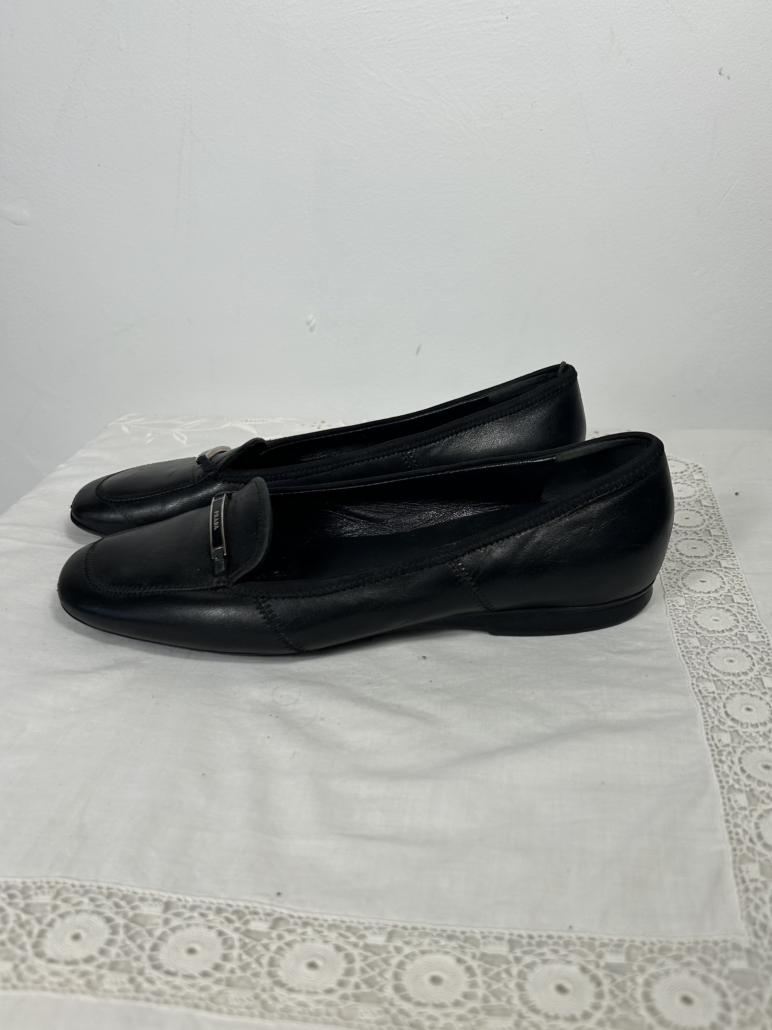 Black Prada loafers with classic red detailing on sole and prada spell out emblem