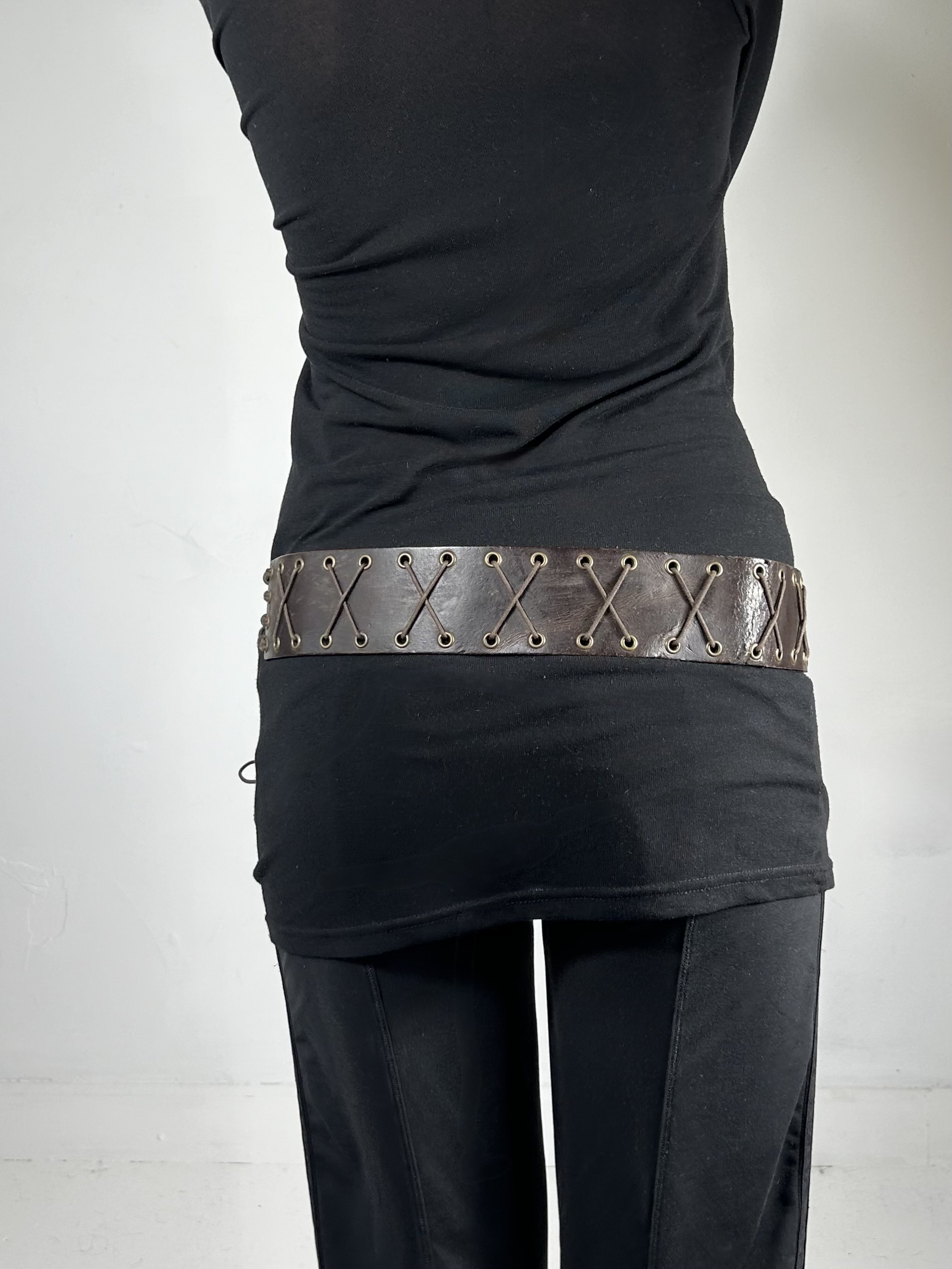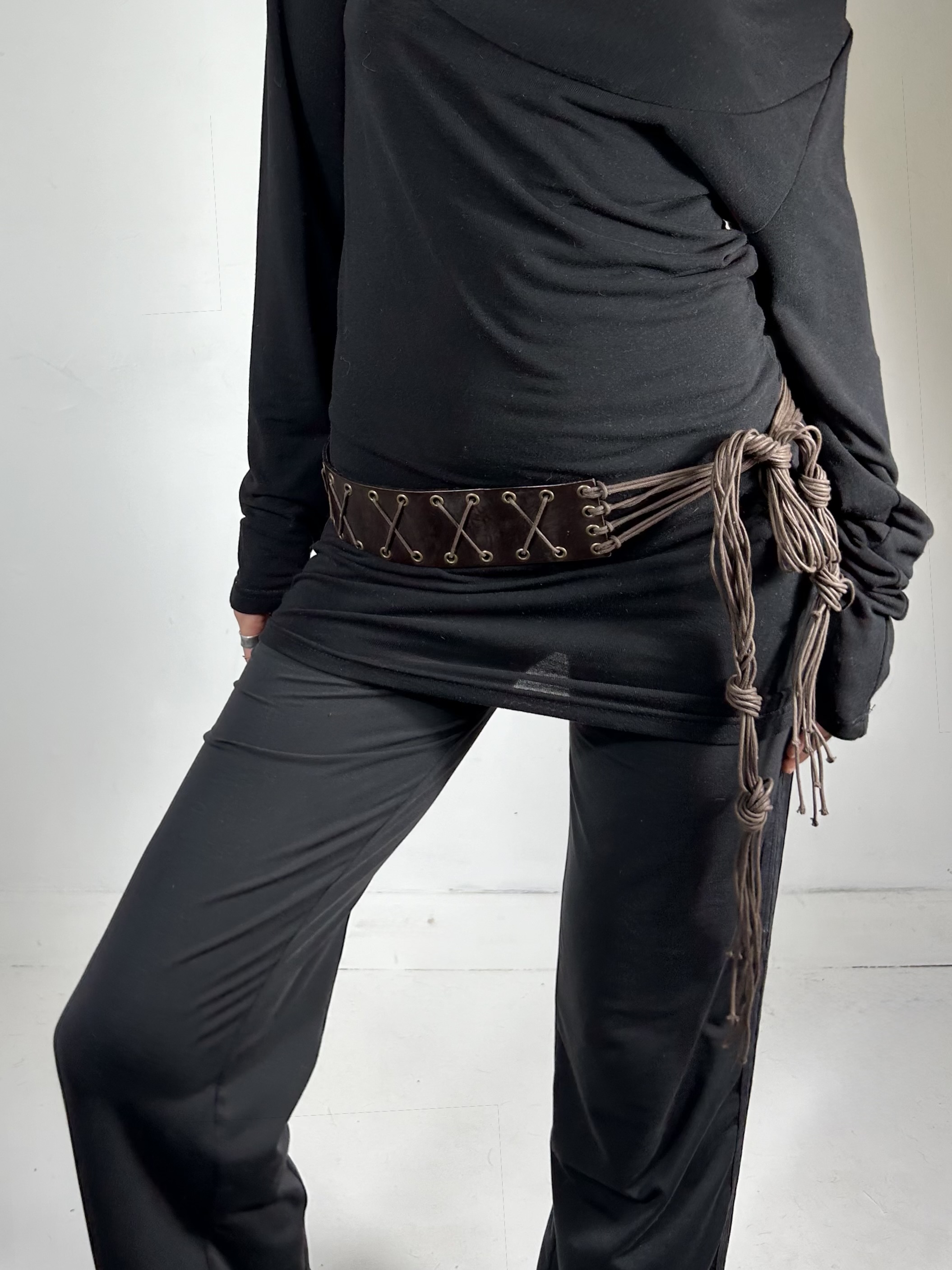 Brown leather tie belt with woven detailing