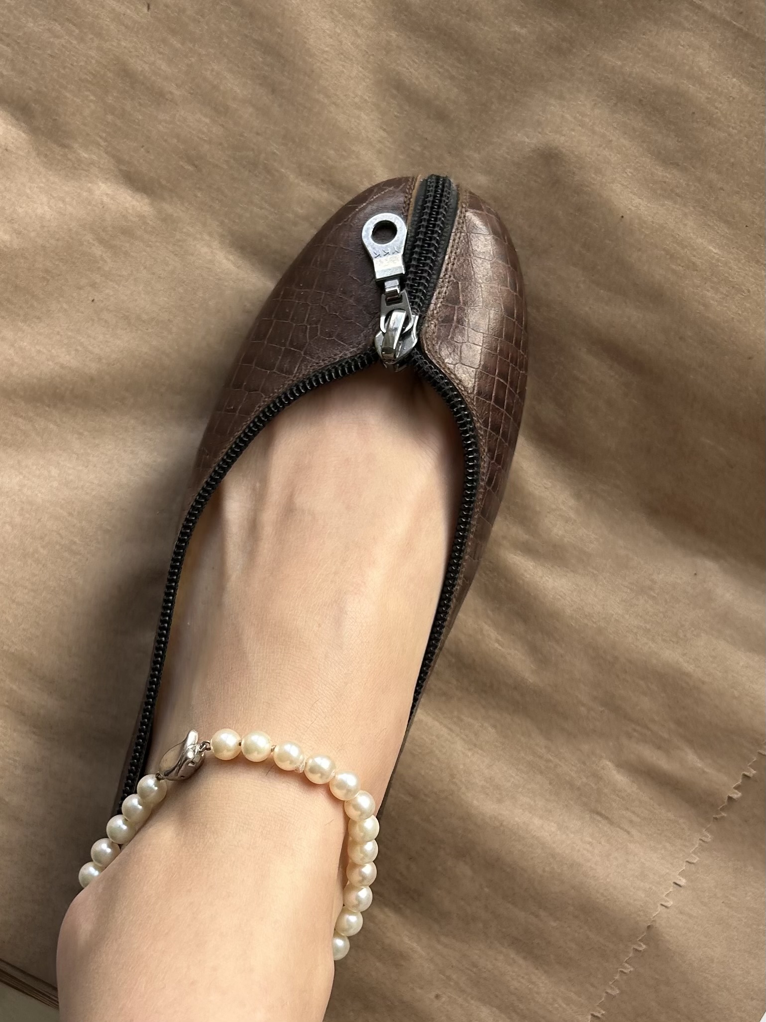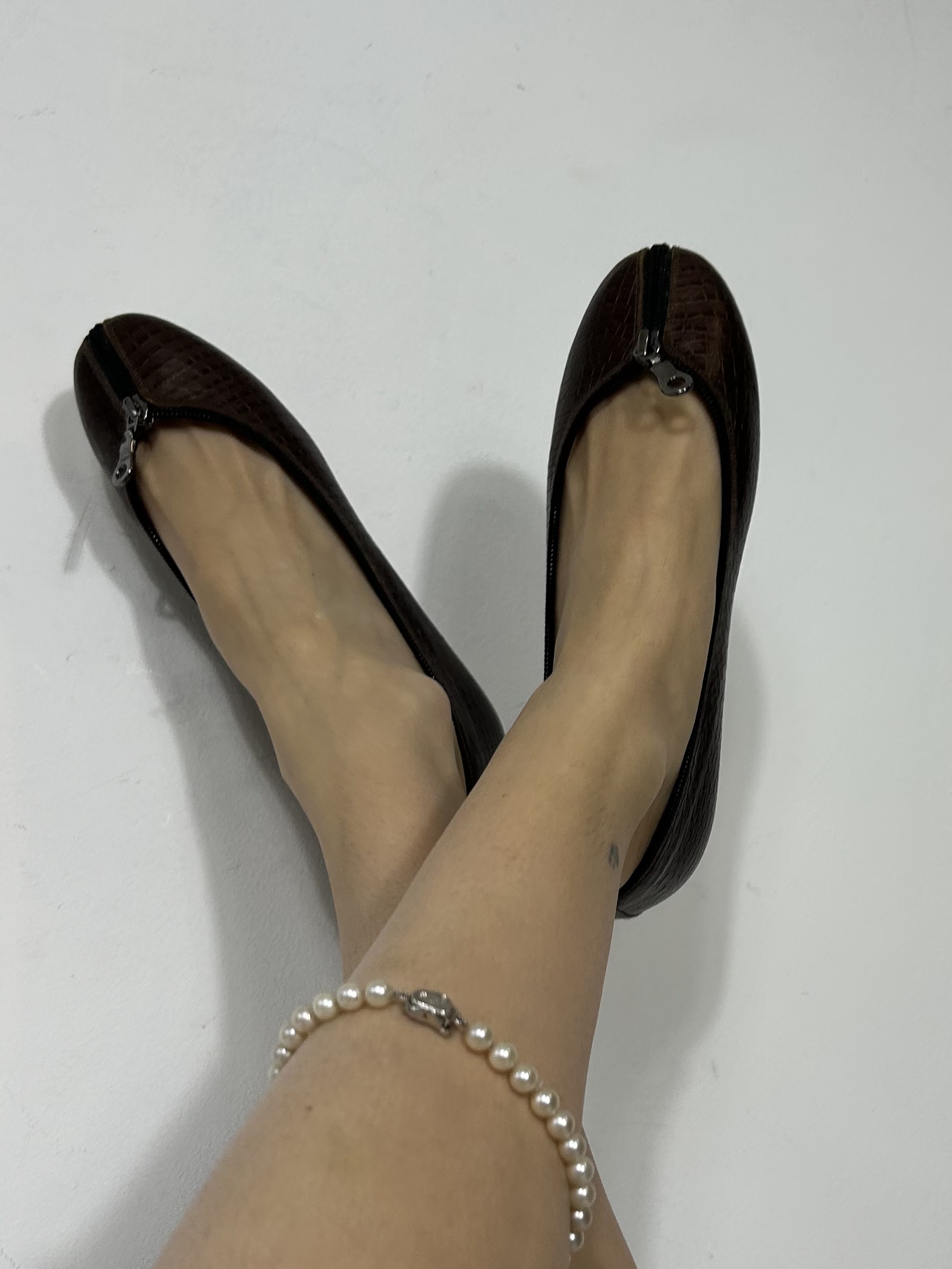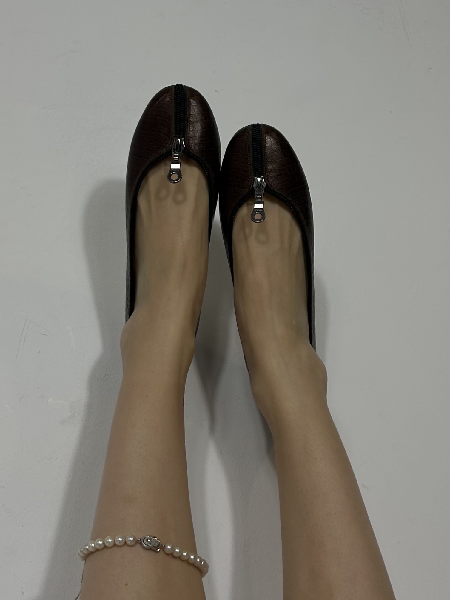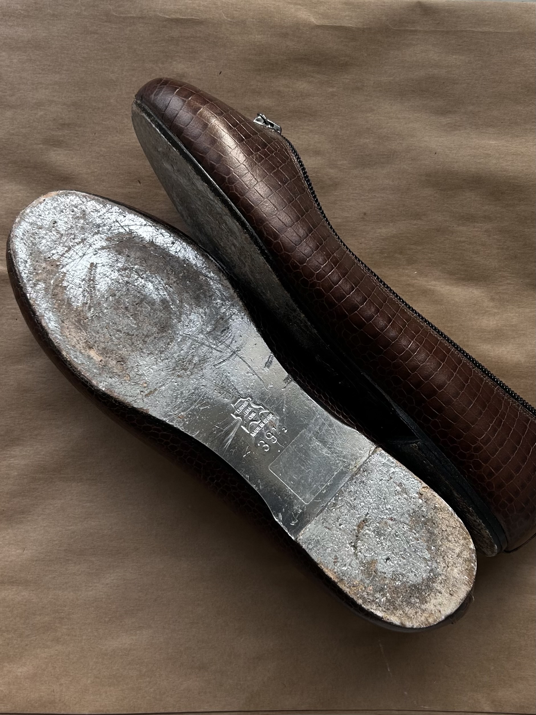 Brown leather snake skin ballet flats with zip detailing and silver sole. Marked as a uk 6 but fit more like a 5